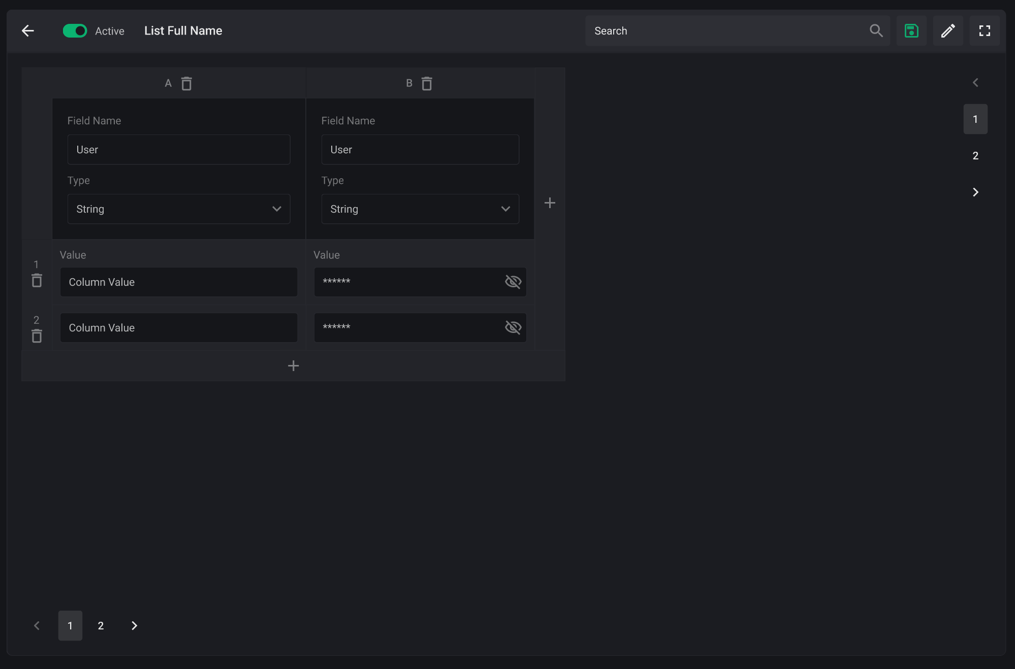 List entries are paginated and searchable, with visibility into each field’s values. Fields can be renamed or deleted, and entries can be added or removed via both UI and automation logic.